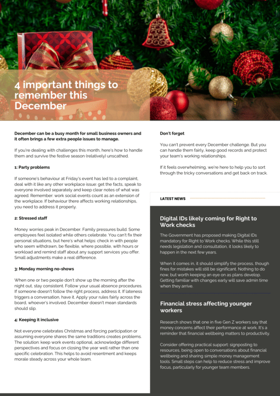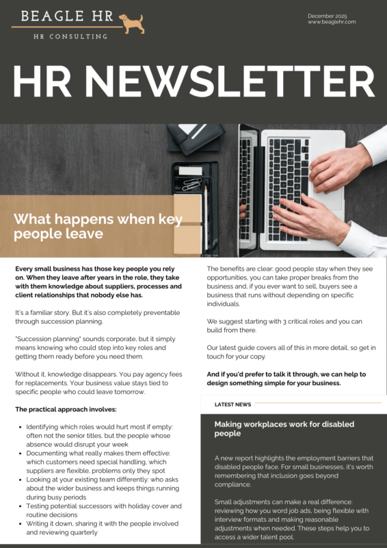 December always has its own energy in small businesses and I think this month’s newsletter catches that mix quite well. It’s the time of year where everything feels both wrapped up and slightly on the edge. People are tired, some are stressed, and managers are trying to keep things steady while also planning for January. Perhaps that’s why topics like succession planning, Right to Work changes and festive-season people issues feel particularly relevant.
